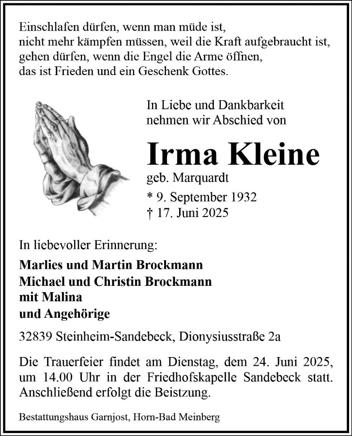 Trauerfeier, Dienstag 24. Juni 2025, 14 Uhr Friedhofskapelle Sandebeck. Anschließend Beisetzung.