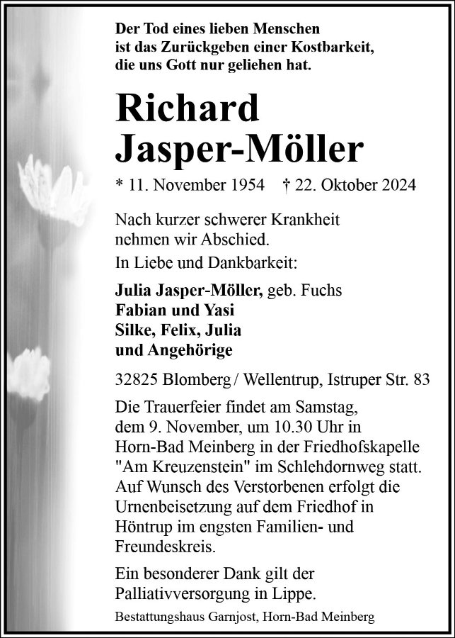 für die kommende Zeit wünschen wir Ihnen viel Kraft, und dass es Ihnen gelingt, dankbar auf die positiven und schönen Erinnerungen zurückzublicken. Diese Gedenkseite möge Ihnen dabei helfen, Ihre Trauer zu teilen und das Andenken gemeinsam wachzuhalten.